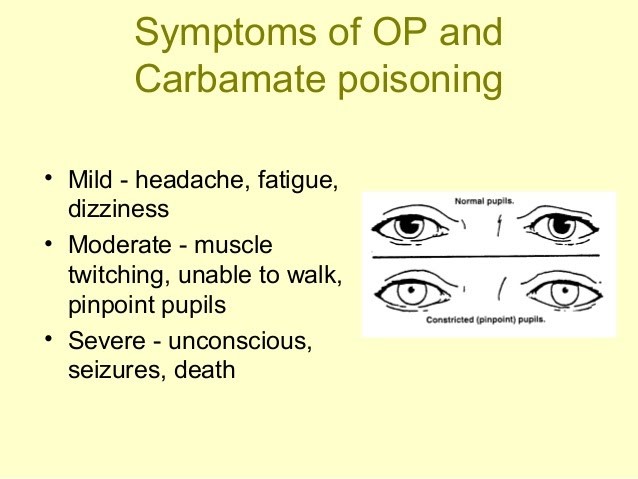 Organophosphates (OPs) are becoming increasingly used in agricultural settings. OPs are one of the main causes of pesticide toxicity in Ecuador. When you get exposed to OPs via ingestion, inhalation, or contact, they irreversibly inhibit the enzyme, acetylcholinesterase (AChE). AChE breaks down acetylcholine (a neurotransmitter) in heart, muscle, and brain neurons. If you inhibit AChE, you will have a buildup of acetylcholine in your synapses which can cause an array of symptoms.