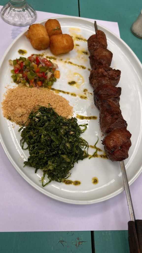 Because of Portugal’s years-long colonial rule over Mozambique, there are many Portuguese influences that have become intertwined with Mozambican culture. I found many Portuguese restaurants in Mozambique, many of which put their own southern african twist on traditional Portuguese foods. One of my favorite meals I had was from a restaurant called Piri-Piri where I ordered grilled chicken, french fries, and vegetable rice. Another restaurant, called Treehouse, served some delicious picanha, which is a style of steak that was first made popular in Brazil and made its way to the Portuguese and eventually to Mozambique. It was served with rice, beans, fried bananas and greens.